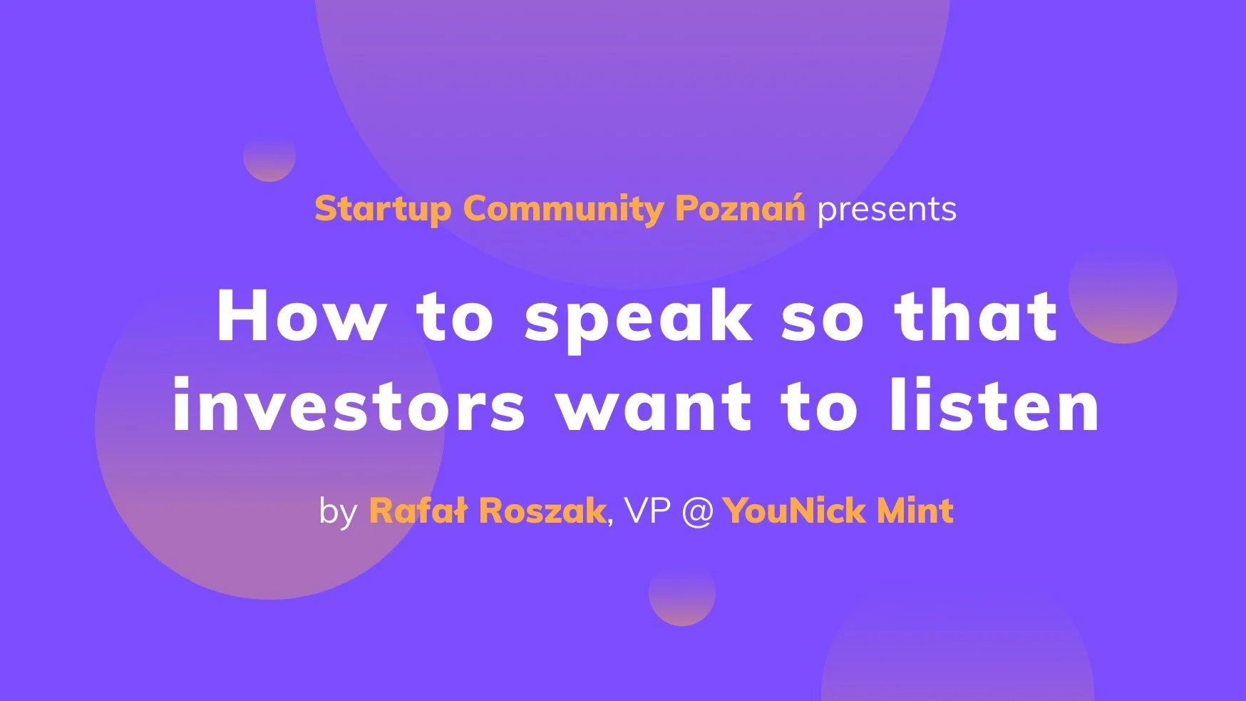 Founders, professionals, and enthusiasts! In recent months, we came up with two meetups helping you in sales processes. This time, the agenda is for those, who need investment to move further! The upcoming speaker, Rafał Roszak @YouNick Mint is an Investment Manager, overseeing mostly innovative projects and research results in the fields of biotechnology, medicine, IT, chemical, environmental protection, and renewable energy sources industries. He is a practitioner, willing to give our startupers’ a few pro tips from "the other guy" perspective. According to our next guest, “karma is a bitch” and poor preparation results in poor reception. There are several good practices, which our speaker is certainly happy to share. We hope that Rafał’s presentation will put some light on the preparation of your pitch decks and support successful fundraising. Traditionally, after the main part, we’ll be hitting one of the local venues to discuss surrounding topics in a friendly atmosphere. It’s a great moment to share experience, team up in specific initiatives, exchange contact details. This time the meetup will take place at Business Link (Maraton), ul. Królowej Jadwigi 43. We hope to see you on Wednesday, 04.12, at 18:00 18:00 - 18:30 - Community: Who is Who and What do you do? 18:30 - 19:15 - "How to speak so that investors want to listen" Rafał Roszak @YouNick Mint 19:15 - .......... Networking and mingle time (location to be announced) The event will be held in English and is free for everyone - by people for people. No profit, no sponsors, no hidden agenda, just people with common passions. See you soon!.